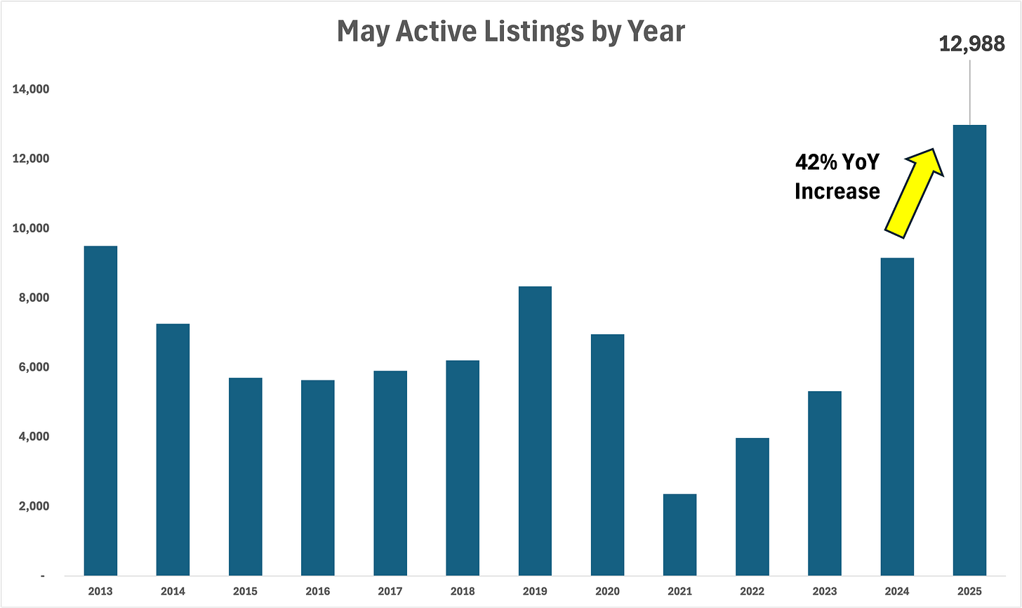 The Greater Metro Denver housing market continued to see elevated inventory in May. When viewing the active supply in May historically, 2025 saw a significant 42% increase when compared to 2024.