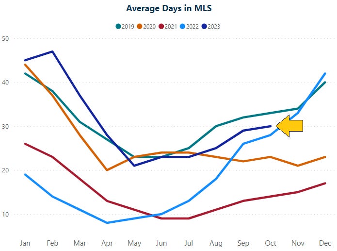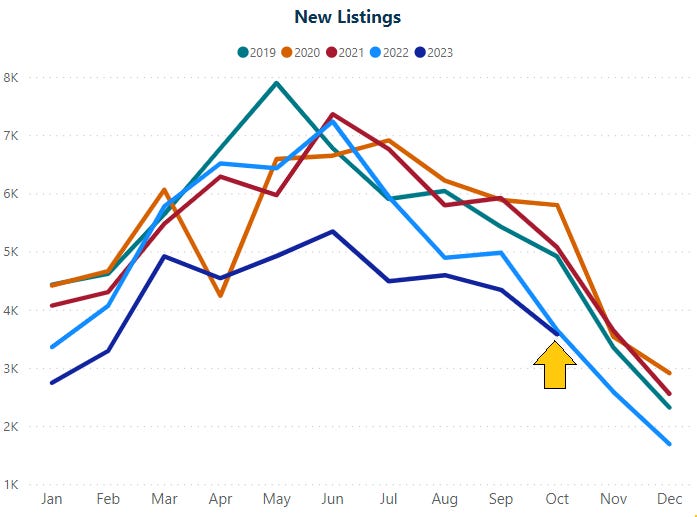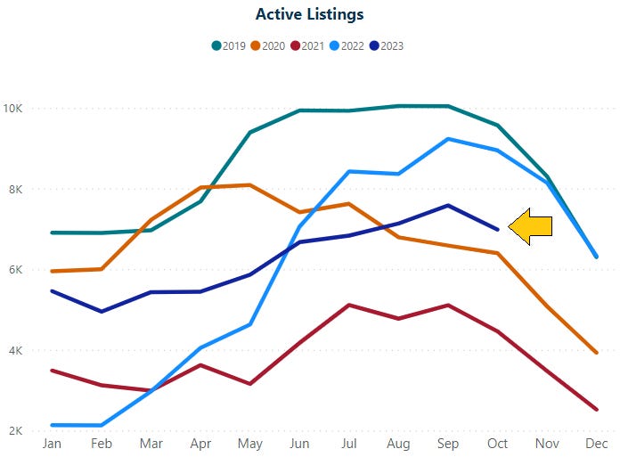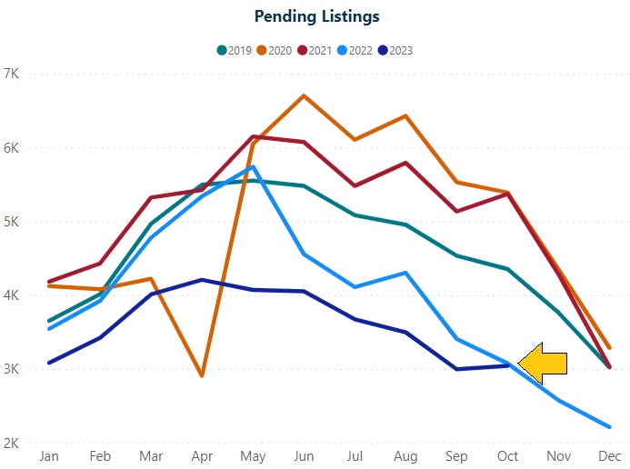 With both seasonality and interest rates at play, October saw fewer active listings, new listings and pending listings when compared to last year at this time. Demand (pending listings) did increase slightly month-over-month, in-line with what we saw at this time in 2022.